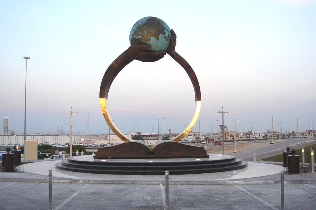 In November 2005 one of Quinn’s largest public sculptures, Rise Through Education, was installed at Aspire Academy in Doha, commissioned by the state of Qatar. Weighing an impressive 8 tons, this monument shows a pair of adult hands placing the world in a child’s hand, the arms forming a circle above an open book. The artist’s commentary on the piece states: ‘A child is the most precious asset our future has. Our obligation is their guidance… It is only through education and knowledge that a person may master his life.’ Quinn created a second sculpture for the interior of the academy to depict striving for excellence; Reaching for Gold is a pyramid of seven arms emerging from a base of sand, the hands straining towards a medal.